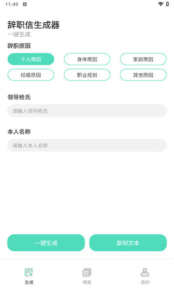 3、界面设计简洁直观,用户可以轻松添加和编辑辞职原因,智能生成相关的文字内容,实现快速且便捷的应用。