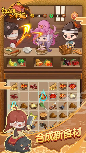 2、收集食材,研究烹饪方法,招揽天下英雄前来,赚取名气和金钱。