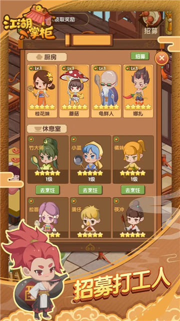 2、个性化人物培养,招收江湖小二,提高武功和烹饪水平,打造一家独一无二的江湖酒馆。