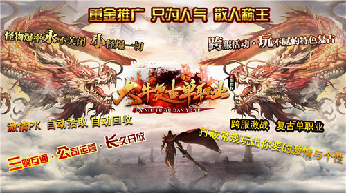 下载大牛复古单职业是一款采用单职业为主要玩法的传奇类游戏,游戏中玩家可以尽情感受热血十足的竞技体验,在这里玩家会遇到实力强大的对手,让玩家们可以轻松重温经典传奇世界,感受畅爽的战斗氛围。