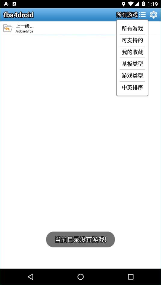 2、直接一键启动fba4droid,于右上角菜单选择“所有游戏”,点击想玩的游戏即可。