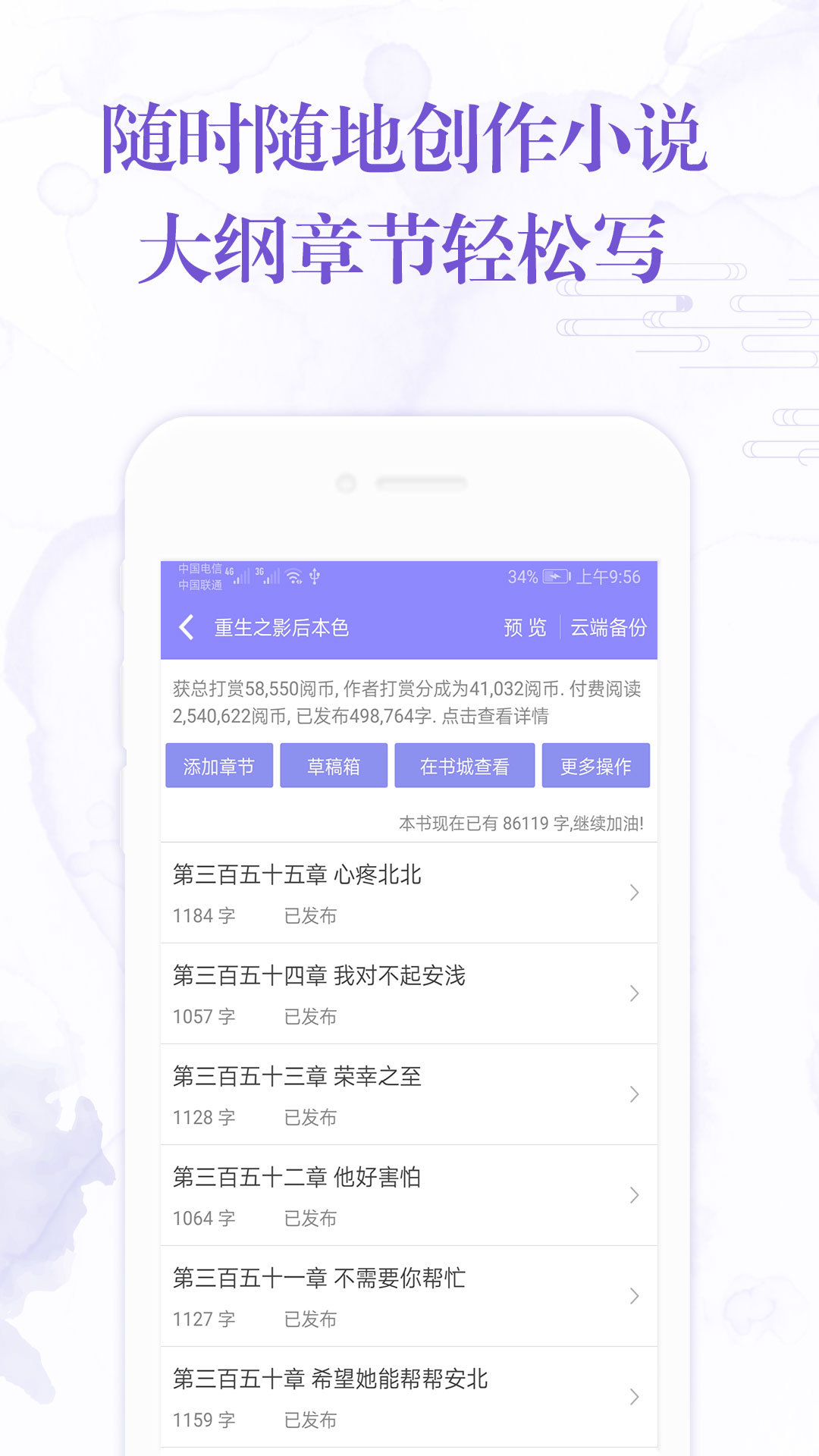 4. 综合评价:阅听手机写小说App凭借其全面的功能设置、良好的用户体验以及对作者成长的支持,成为了众多写作爱好者的首选工具。