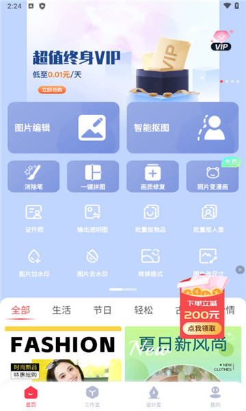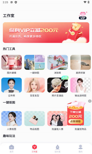 1、集成了图片编辑、智能抠图、无痕消除、一键拼图等多种功能,能够满足用户多样化的编辑需求。