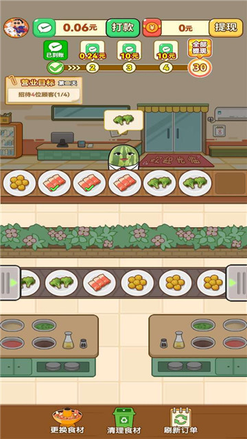 1、通过消灭各种材料,并按照客人的需求,将菜肴摆在自己的盘中。