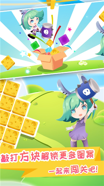 只要把方块拖到要清除的方块中,把所有的方块都清除掉,就可以赢得比赛,玩家可以随意的挑选不同的道具,解锁不同的图案,三个组合就可以解决,娱乐游戏有很多的关卡可以玩,绝对不会厌倦。