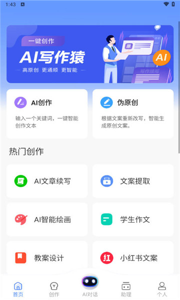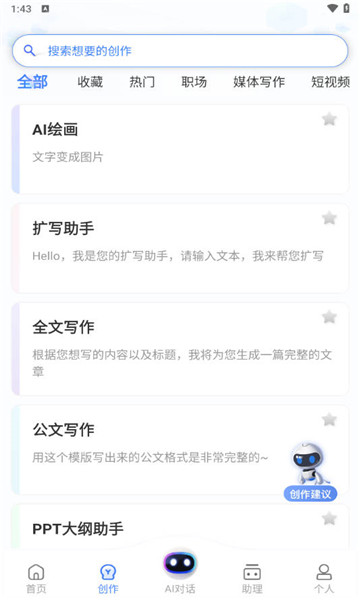 1、软件具有AI创作功能,允许用户利用该工具快速创作多种类型的文章。