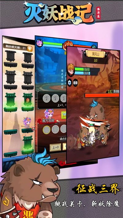 下载灭妖战记是一款多元素的休闲挂机游戏,以西游为游戏背景,采用Q版画风绘制角色。灭妖战记在挂机方面颠覆了传统无脑挂机的模式,还原了西游取经路线上的经典妖怪,游戏内含有上百关卡,有几十种简单又新奇的奇遇事件等你来探索,另外还有抓宠系统,有多达92种妖兽等你来抓捕。