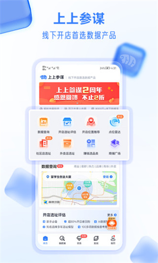 1.上参谋实用性强,一站式解决开店难题,尤其选址,用户反馈大大减轻市场调研负担。