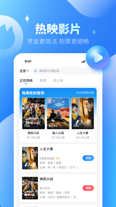 1.E票电影软件界面设计清新,分类明确,操作逻辑清晰,用户体验流畅。