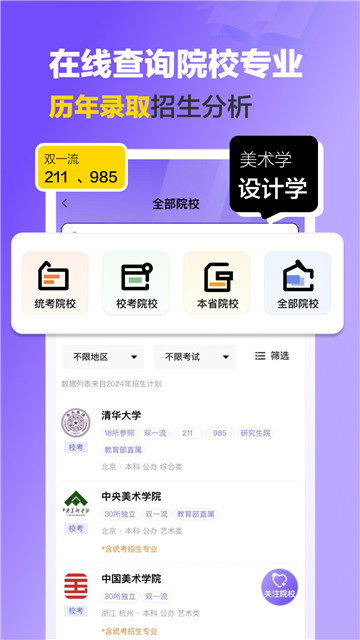 1、对各类美术学院进行分级浏览,迅速连接至学校官网及录取须知。