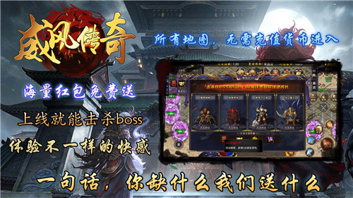 下载威风传奇是一款上线就有超高攻速的传奇类游戏,游戏中高度自由的玩法,没有任何限制,玩家可以自由的探索庞大的传奇世界,各种怪物爆率超高,海量的装备和材料尽情获得,让你重温当年的热血与激情。
