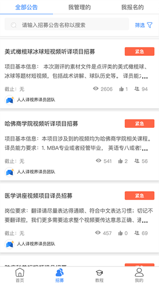 4、用户可以查看自己管理的翻译任务或已报名的职位。