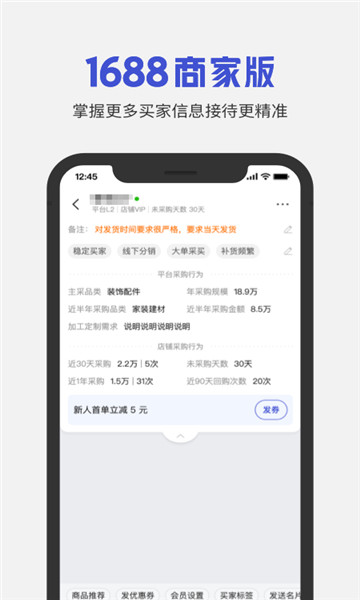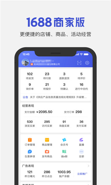 下载1688商家版是一款专为1688的商家提供的办公平台,提供移动端的便捷的管理店铺,为广大的商家提供一站式的处理体验。随时随地通过手机来进行操作,再也不用时刻盯在电脑前,各种消息也会第一时间进行通知,操作起来也非常的简单,只需简单的几步就能处理好。