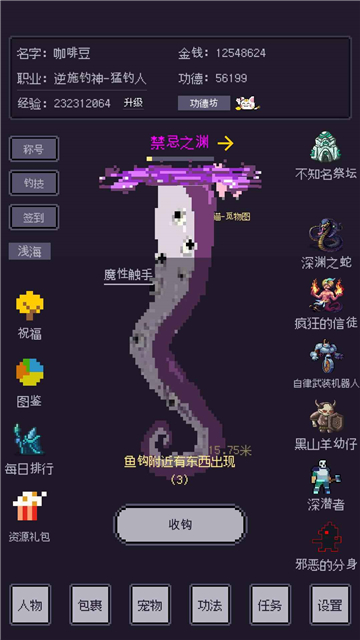 3. 增加了副本特有的钓竿,魔性触手,此钓竿拥有特殊技能,可垂钓所有非限定地图物品