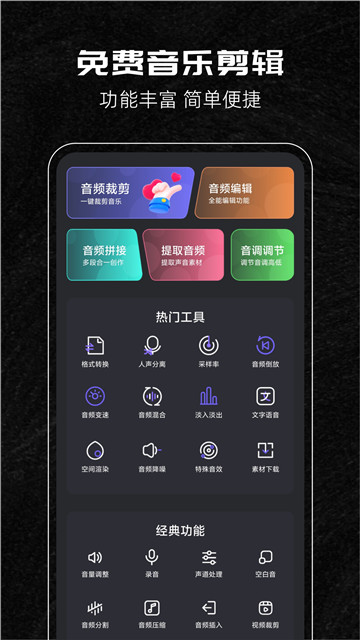 下载音乐剪辑助手是一款可以让用户在手机上进行音乐编辑的软件,整体的功能非常的使用,让你进行比较流畅的素材合并功能,可以快速进行剪辑,帮助用户更好的完成需要的声音编辑功能,让你可以在这里处理各种需要,提高整体的工作效率。