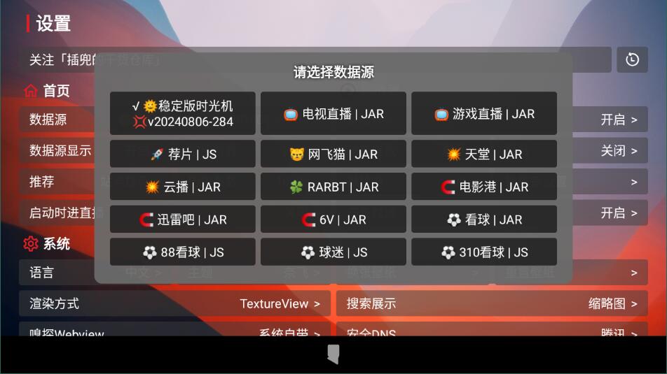 稳定版时光机v20240806-284、荐片、云播JAR、迅雷吧JAR、88看球JS、电视直播JAR、网飞猫JAR、SRARBTJAR、6VJAR、球迷JS、游戏直播JAR、薬天堂JAR、电影港JAR、看球IJAR、310看球JS、短剧驿站JAR、美柏JAR、皮皮JAR、AVidJAR、女可可JAR、FREEOK、短剧吧JAR、虎虎JAR、卫总JAR、9527JAR、低端JAR