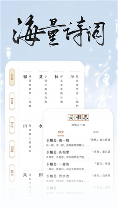 长相思古诗专为诗词爱好者精心打造的文化宝库,汇集了海量经典古诗与权威详解,带你穿越千年时光,感受中华诗词的独特魅力。长相思古诗app下载融合精美国画手绘和动态场景动画,让每一首古诗都如生动故事般鲜活呈现,诗意画境浸润心田,仿佛走进诗人笔下的风雅世界。无论是背诵、写作灵感、起名典故,还是节日祝福,长相思古诗手机版下载都能精准分类,满足你不同场景的诗词需求。长相思古诗安卓版下载有智能学习计划和科学记忆曲线加持,帮助你高效掌握诗词内容,轻松建立复习习惯,真正做到学而时习之。