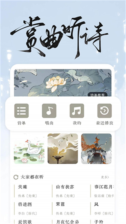 1. 打开软件,来到主页庭院,遇见李白、杜甫、李清照、辛弃疾、苏轼等古代名人,他们会吟诵经典诗句,点进去还能看到详细解析。