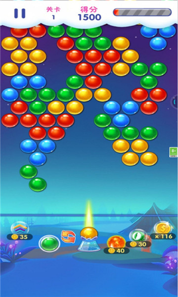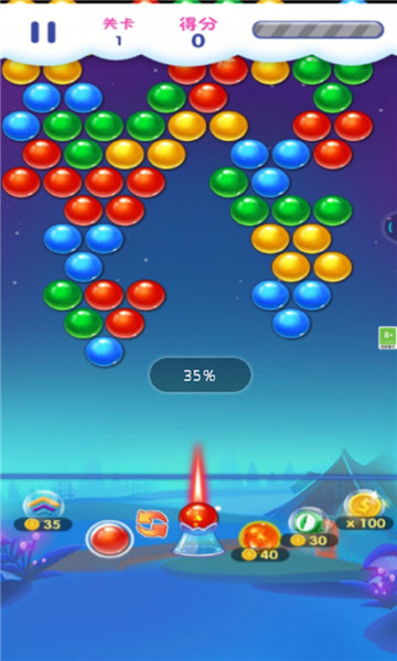 1、轻点屏幕,指定泡泡射击的位置射击3个或3个以上相同颜色的泡泡,就会一起消失。