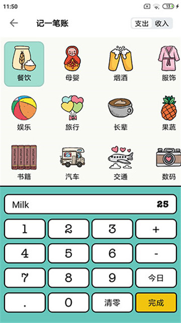 2、一键记账,记账就是这么简单,多种账目分类,让您的账单清清楚楚。