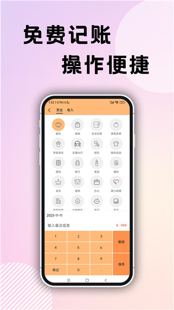 2、可爱简洁的界面,轻松快捷2步完成记账,超多预设分类,满足不同的记账场景,还能自定义分类,排序,简单方便。