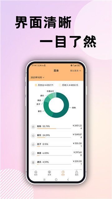3、一目了然的收支图表,帮你快速了解分析消费情况,消费支出清晰呈现。