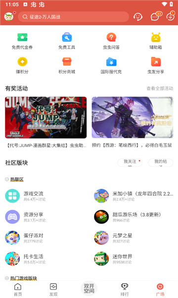 5、点开广场,有平台推荐的热门活动,还有游戏社区,玩家可以社区相互交流;
