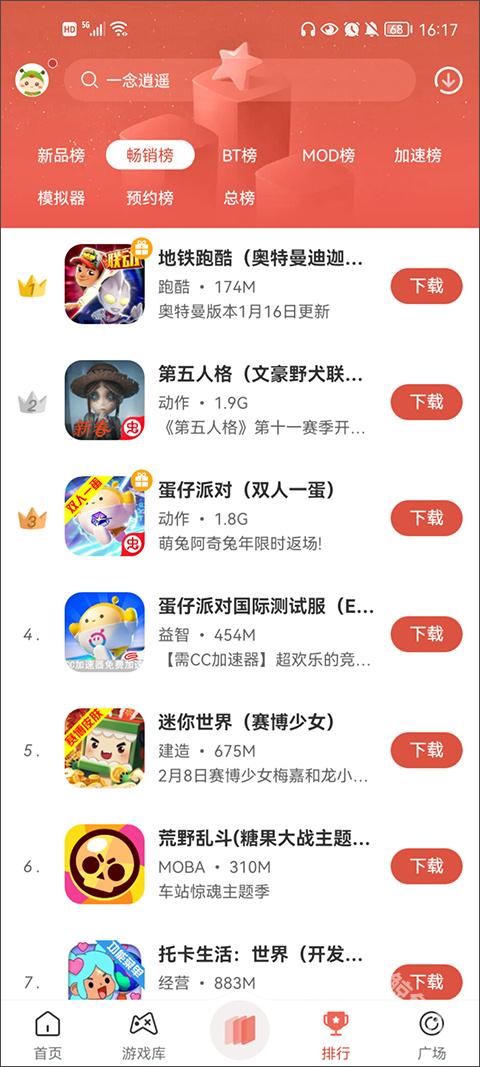 4、点开排行,有新品榜、畅销榜、BT榜、MOD榜、预约榜等多种游戏排行榜供玩家选择;