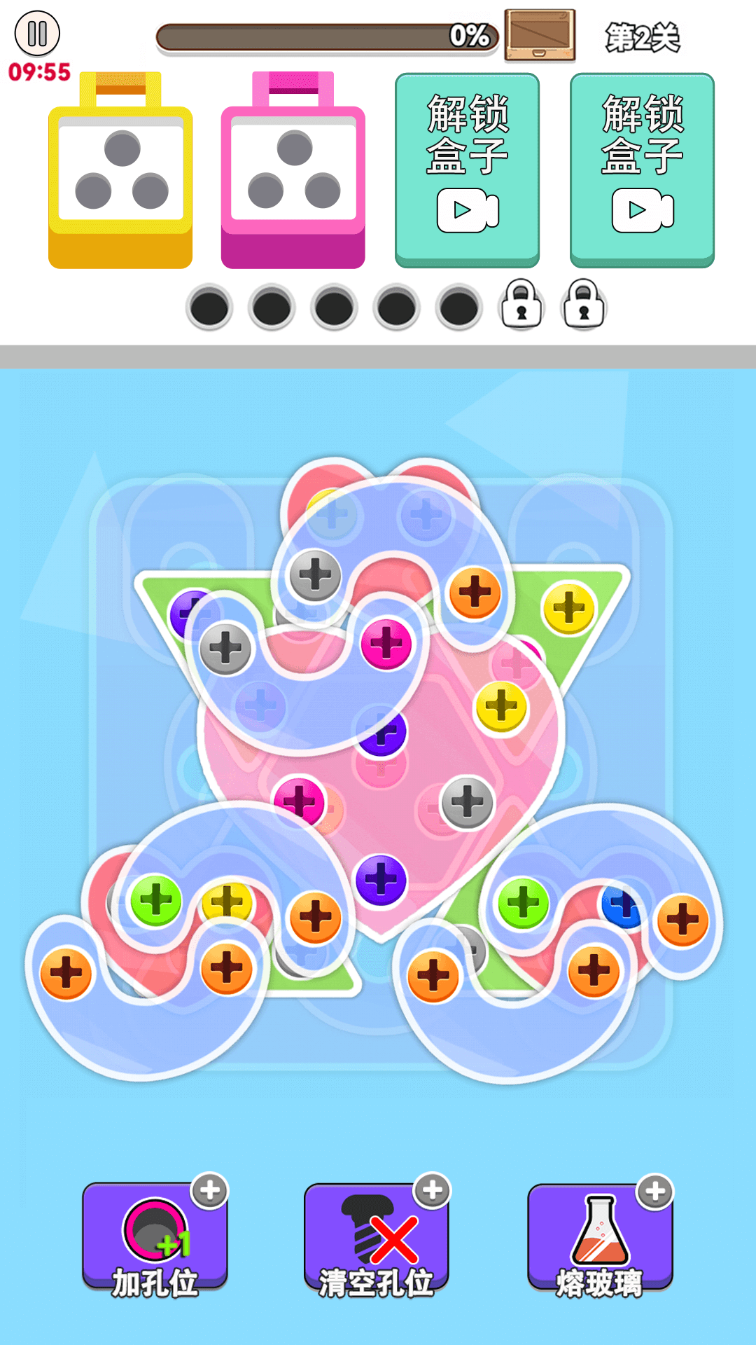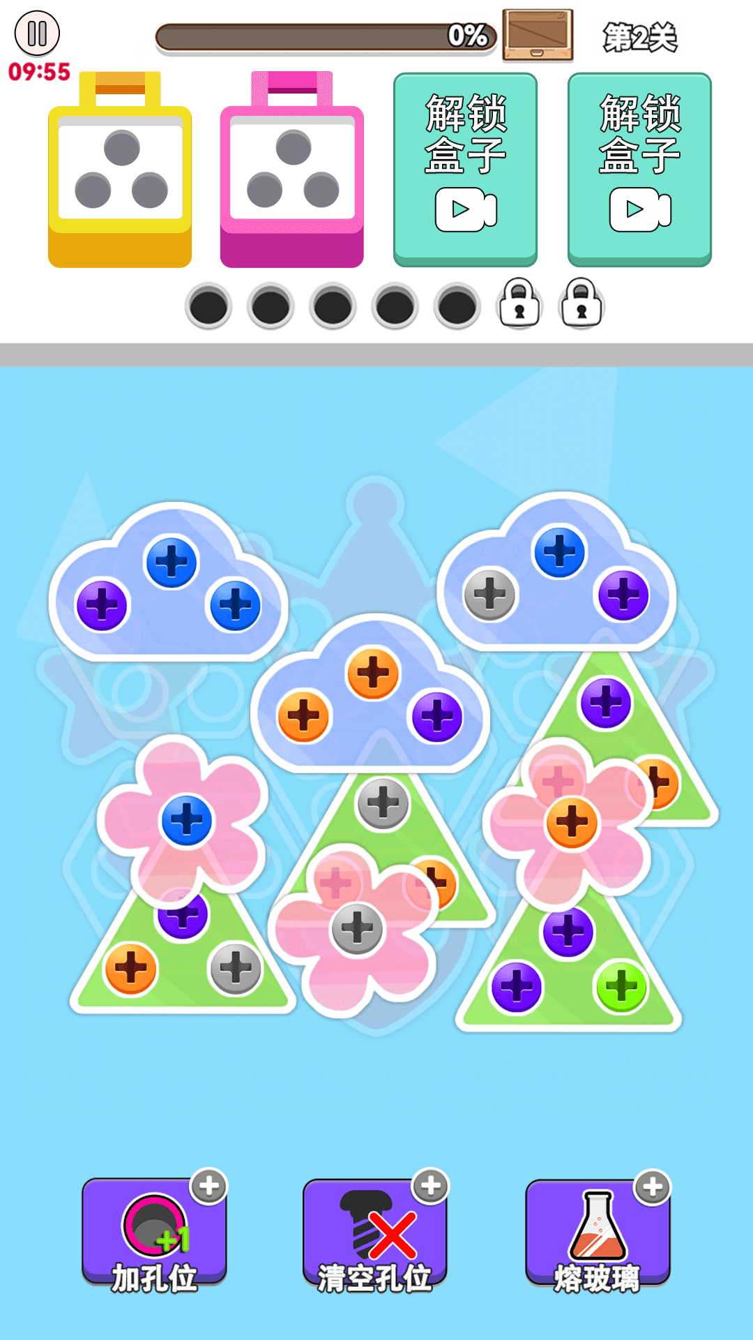 2、相同颜色的螺丝集齐三个就能消除,所有不用担心会出现收纳盒孔位不足的情况,除非是出现操作失误。