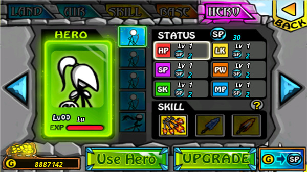 游戏中不但士兵可以升级,英雄也是可以升级的。让我们在游戏开始前点击英雄头像,选择英雄选项后我们便可以根据需求对英雄的各个属性进行升级。小编提醒你,升级英雄不消耗金钱但消耗SP值,所以要考虑清楚选择对自己最有用的属性哦。
