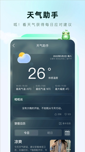 3、依据天气情况,推荐合适的衣物搭配,记录天气穿衣档案。