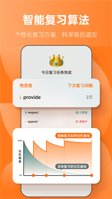 1、采用学习、复习两套科学的智能算法,自动根据你的记忆效果智能调整你的单词学习安排。