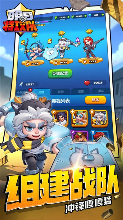 各种类型的英雄等着你去解锁、升级,双枪齐发、强力武器、各种超强技能纵横战场。