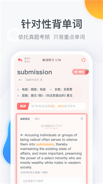 1、新增答题辅助功能:听力跟读字幕、阅读材料译文、写作提纲、翻译提示等等,犹如“开挂”,降低做题难度。