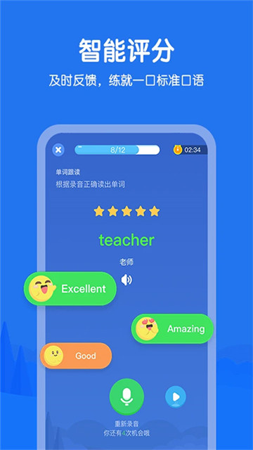 3、支持逐句模仿跟读和实时评测,可以及时的为您进行纠正,让你可以有效的提高自己的口语能力。