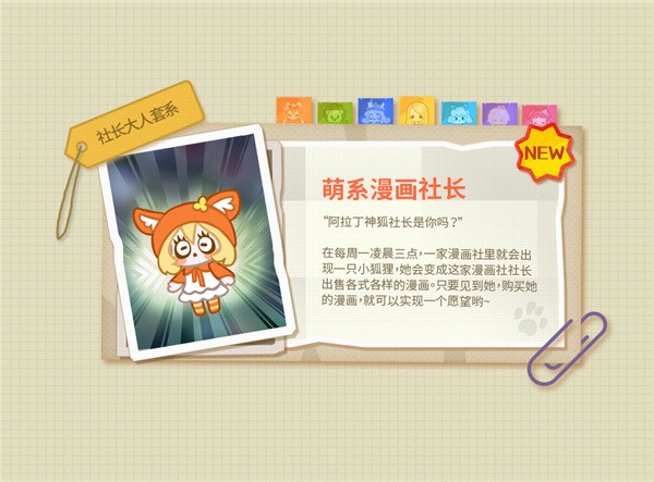 在每周一-凌晨三点:一家漫画社里就会出现一只小狐狸,她会变成这家漫画社社长出售各式各样的漫画。只要见到她购买她的漫画,就可以实现一个愿望哟~
