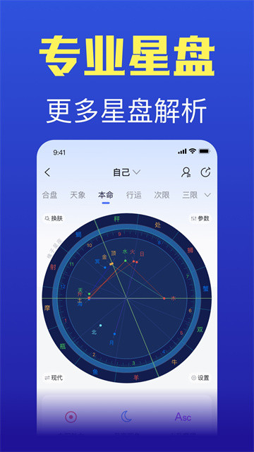 2、提供本命盘、天象盘、合盘、行运盘、次限盘等专业星盘,并集现代占星和古典占星于一体。