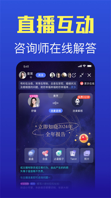 1、专业占星师、心理咨询师主题性直播、案例分析,帮您看清身边的人设,每天有免费直播间帮您分析情感问题。