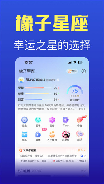下载橡子星座app是一款具有非常全面星座相关内容的软件,支持根据需要进行内容的查看,其中的功能比较全面,可以帮助用户更好的进行星座内容了解,而且具有一个社区的功能可以使用,用户可以和其他人进行交流,分享自己的心事,帮助用户在线进行预测的功能。