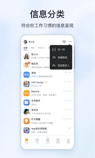1、信息分类:帮助用户按工作需求、项目或团队分类管理信息,确保沟通有序。