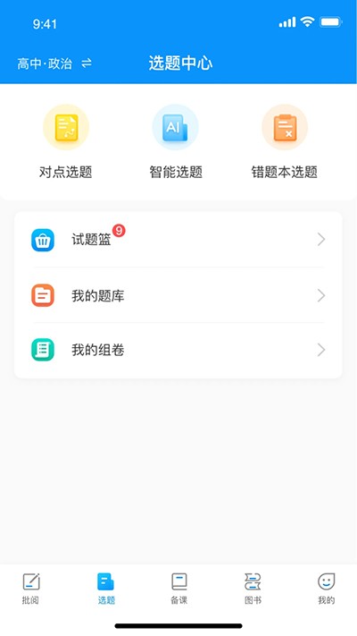 点击底部导航的【批阅】按钮,再点击顶部导航的【考试】选项。