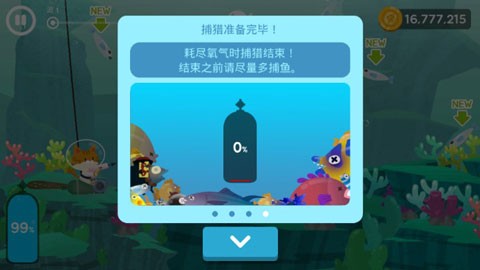 耗尽氧气时捕猎结束,结束之前请尽量多捕鱼。