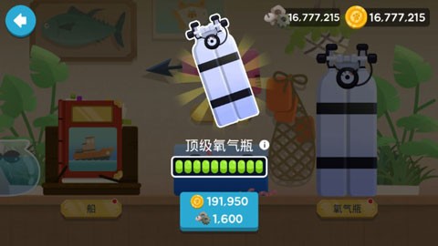 1、氧气瓶:消耗一定的金币和零件即可强化升级氧气瓶,从而让你在水下的时间更长。