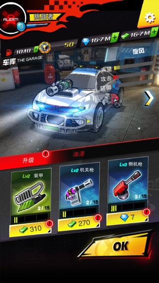 4、掌握技巧,赛车的改装同样重要,升级装甲、机关枪和侧机枪,让你战斗力爆表。