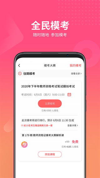 4、全民模考:设置模拟考试环节,让学员在真实考试环境中进行自测,帮助熟悉考试形式。