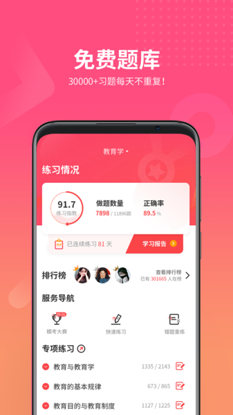 1、30000+习题每天不重复:提供海量的习题库,每天更新,确保考生练习内容的多样性和不重复,帮助巩固知识点。