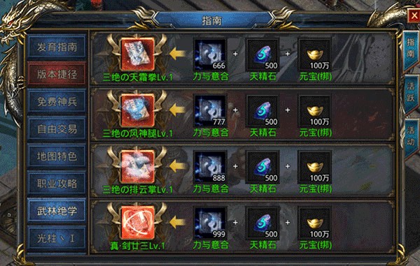 逐步收集专属装备或专属秘籍,一步步晋升至终极神兵神装