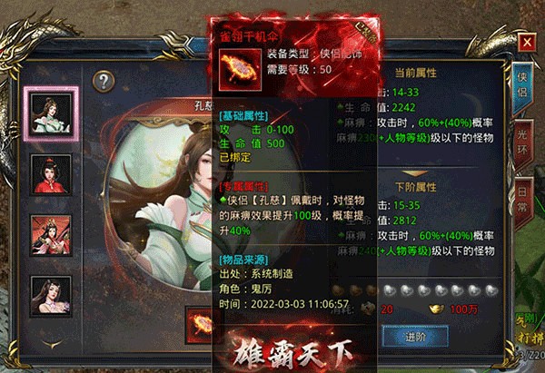 功能:专属装备、专属秘籍、侠侣配饰等可组成套装效果