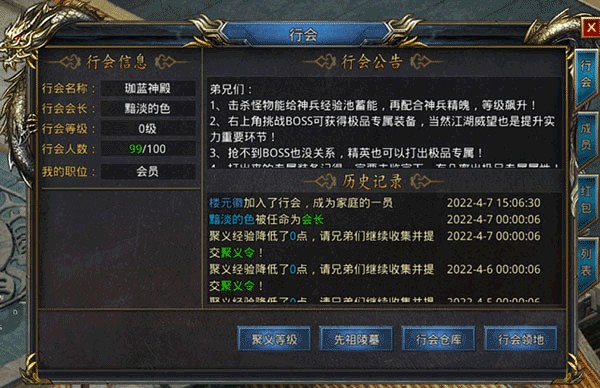 在行会聚义等级中提交聚义令可提升行会聚义等级并获得强力属性及宝箱(属性是行会全员共同享有的哟~)