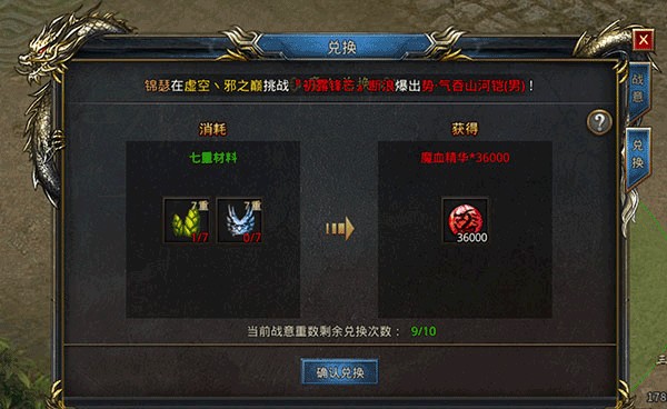 玩法介绍:消耗1-15重战意材料,兑换一定的魔血精华(每日兑换有上限,所以尽可能兑换完哟~)